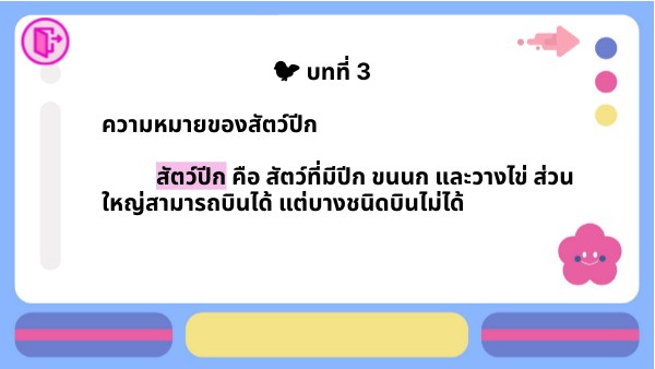 🐦 บทที่ 3 ความหมายของสัตว์ปีก สัตว์ปีก คือ สัตว์ที่มีปีก ขนนก และวางไข่ ส่วนใหญ่สามารถบินได้ แต่บางชนิดบินไม่ได้