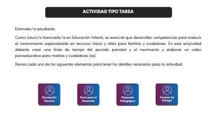 Estimado/a estudiante: Como futuro/a licenciado/a en Educación Infantil, es esencial que desarrolles competencias para traducir el conocimiento especializado en recursos claros y útiles para familias y cuidadores. En esta actyividad deberás crear una línea de tiempo del periodo prenatal y el nacimiento y elaborar un video psicoeducativo para madres y cuidadores (as). Revisa cada uno de los siguientes elementos para tener los detalles necesarios para la actividad.