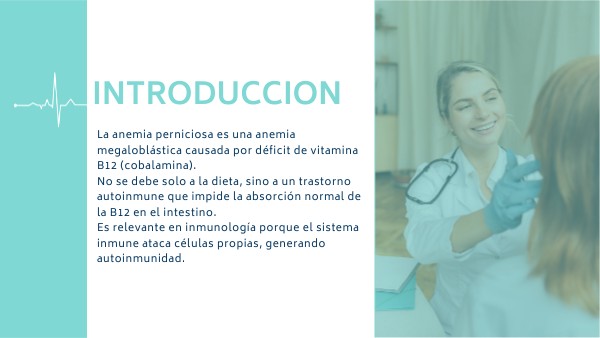 La anemia perniciosa es una anemia megaloblástica causada por déficit de vitamina B12 (cobalamina). No se debe solo a la dieta, sino a un trastorno autoinmune que impide la absorción normal de la B12 en el intestino. Es relevante en inmunología porque el sistema inmune ataca células propias, generando autoinmunidad.
