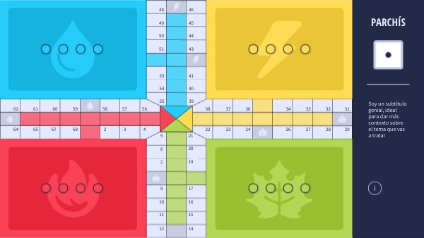 🎲 PARCHÍS: INSTRUCCIONES PARA PASARLO GENIAL Jugadores: De 2 a 4 personas. Fichas y Casa: Cada jugador elige un color (amarillo, azul, rojo o verde) y tiene 4 fichas de ese color. Cada uno empieza en su "casa", que es la zona del tablero del mismo color. Casillas Seguras: Hay 8 casillas especiales (grises con símbolo) donde tus fichas están a salvo de ser capturadas. Objetivo: ¡Ser el primero en llevar tus 4 fichas desde la casa hasta la meta, recorriendo todo el tablero! 🚀 Cómo se Juega Inicio: Todos lanzan el dado digital. El que saque el número más alto, empieza. Salir de Casa: Saca un 5 en el dado para mover tus fichas fuera de casa. Moviendo Fichas: Lanza el dado y mueve una ficha tantas casillas como indique el dado. ¡Doble Turno con el 6!: Si sacas un 6, juegas otra vez. Y si todas tus fichas están fuera de casa, el 6 cuenta como 7. Puentes: Si dos fichas del mismo color están en la misma casilla, forman un puente y bloquean el paso a los demás. Abrir Puentes: Si sacas un 6 y tienes un puente, debes mover una de esas fichas. Capturar Fichas: Si caes en una casilla con una ficha contraria (que no sea segura), la capturas y la mandas a su casa. ¡Y mueves una de tus fichas 20 casillas! Llegando a Meta: Da la vuelta al tablero y saca el número exacto en el dado para entrar en la meta. En la fila de llegada, tus fichas están a salvo de ser capturadas. Contando 10: Si una ficha llega a la meta, mueve otra de tus fichas 10 casillas. 🏆 Ganar el Juego La primera persona que logre meter sus 4 fichas en la meta, ¡gana!