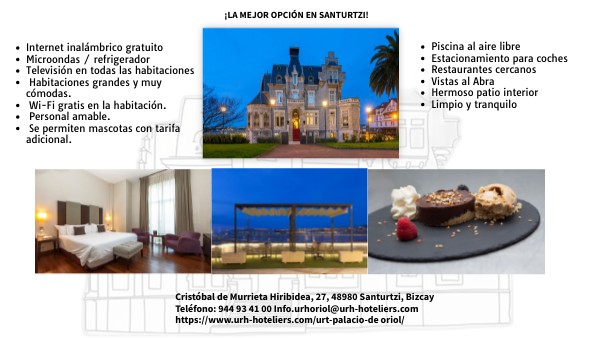 Cristóbal de Murrieta Hiribidea, 27, 48980 Santurtzi, Bizcay Teléfono: 944 93 41 00 Info.urhoriol@urh-hoteliers.com https://www.urh-hoteliers.com/urt-palacio-de oriol/