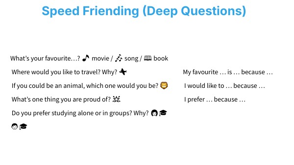 π 10 Deep Questions (Prompt Sheet) π If you could live anywhere in the world, where would it be? Why? π΅ What song or piece of music always makes you feel good? Why? π What book / movie / TV series has inspired you the most? π°οΈ If you could travel to the past or the future, which would you choose? π‘ What is something you are really proud of in your life? π If you could have one superpower, what would it be and why? π©βπ« Which teacher or person has influenced you the most? How? π― What is one goal or dream you have for the next 5 years? π€ Would you rather always know the truth or always be happy? Why? π« What do you value most in a friendship?