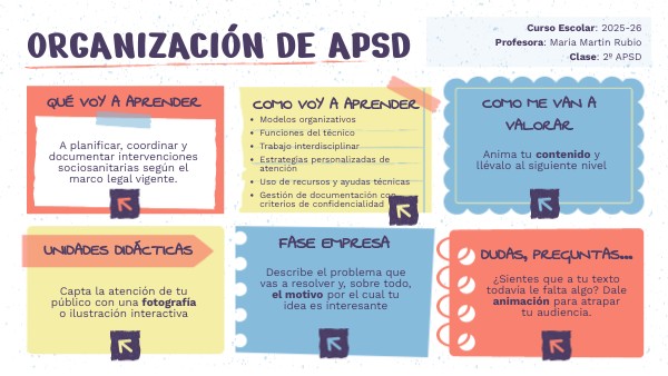 a) Pruebas escritas u orales • Preguntas tipo test, de desarrollo o exposición oral. • Casos prácticos relacionados con la organización de la atención. b) Tareas o proyectos prácticos • Diseño de un plan de intervención. • Análisis de un programa de atención. • Organización de recursos y espacios en un entorno simulado. c) Observación directa • Valoración de la participación en clase, debates o simulaciones. • Comprobación de cómo aplican los principios organizativos y metodológicos en actividades prácticas. d) Portafolio del alumno • Recopilación de trabajos, ejercicios y reflexiones sobre el módulo.