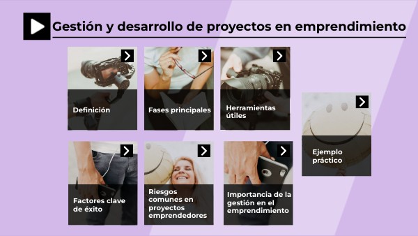 Gestión de proyectos en emprendimiento Es el proceso planificado y sistemático de organizar, coordinar y supervisar los recursos (tiempo, dinero, personas, materiales y conocimiento) para lograr los objetivos de un proyecto dentro de un emprendimiento. Implica aplicar métodos, herramientas y técnicas que permitan alcanzar resultados de manera eficiente, reduciendo riesgos y maximizando las oportunidades de éxito. En otras palabras, es cómo llevar la idea emprendedora a la práctica, asegurando que las tareas se ejecuten en el orden correcto, con los recursos adecuados y en los plazos establecidos. Desarrollo de proyectos en emprendimiento Hace referencia a la etapa de creación, diseño, validación y puesta en marcha de un proyecto dentro del ámbito emprendedor. Incluye desde la generación de la idea de negocio hasta la implementación y escalamiento de la solución. Se centra en el crecimiento y evolución del proyecto: definir la propuesta de valor, analizar el mercado, validar clientes, elaborar el modelo de negocio y ejecutar estrategias que permitan que el proyecto sea viable, sostenible e innovador.