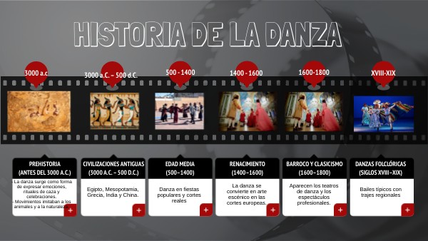 Época: hace más de 3000 añosDónde: templos, teatros, palacios Características: En Egipto bailaban para los dioses con movimientos suaves de brazos y caderas. En Grecia bailaban en festivales y teatro, expresando historias. En Roma había desfiles con bailarines en fiestas públicas. Dato curioso: Las danzas contaban historias sin palabras.