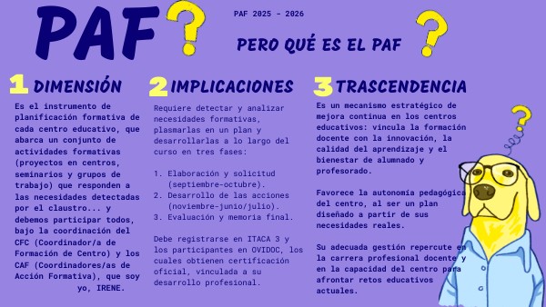 Es el instrumento de planificación formativa de cada centro educativo, queabarca un conjunto de actividades formativas (proyectos en centros, seminarios y grupos de trabajo) que responden a las necesidades detectadas por el claustro... y debemos participar todos, bajo la coordinación del CFC (Coordinador/a de Formación de Centro) y los CAF (Coordinadores/as de Acción Formativa), que soy yo, IRENE.