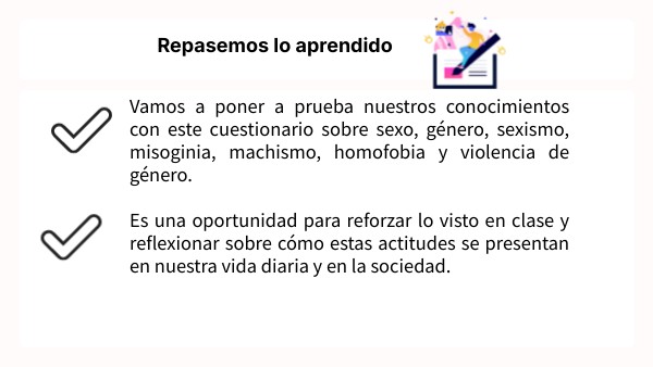 Vamos a poner a prueba nuestros conocimientos con este cuestionario sobre sexo, género, sexismo, misoginia, machismo, homofobia y violencia de género. Es una oportunidad para reforzar lo visto en clase y reflexionar sobre cómo estas actitudes se presentan en nuestra vida diaria y en la sociedad.