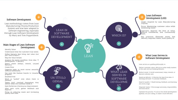 Lean serves as a guiding philosophy to: Deliver customer value →Focus on what really matters to the user, not just building features. Reduce waste → Avoid unnecessary steps, rework, or features nobody uses. Speed up delivery → Shorten the time from idea → working software → customer feedback. Improve quality → Build testing, feedback, and learning into every stage. Empower teams → Encourage autonomy, responsibility, and innovation. Optimize the process → Look at the whole development pipeline, not just coding, to make it more efficient.