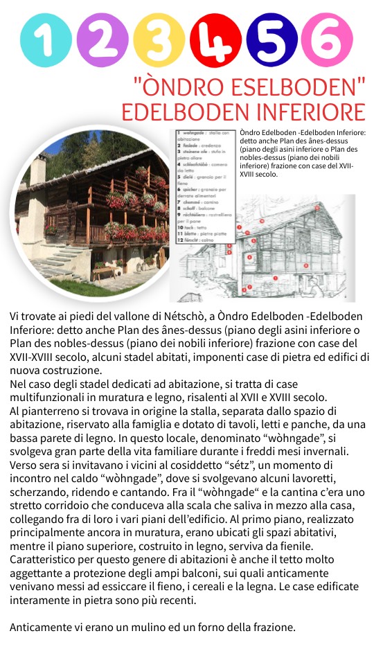 Vi trovate ai piedi del vallone di Nétschò, a Òndro Edelboden -Edelboden Inferiore: detto anche Plan des ânes-dessus (piano degli asini inferiore o Plan des nobles-dessus (piano dei nobili inferiore) frazione con case del XVII-XVIII secolo, alcuni stadel abitati, imponenti case di pietra ed edifici di nuova costruzione. Nel caso degli stadel dedicati ad abitazione, si tratta di case multifunzionali in muratura e legno, risalenti al XVII e XVIII secolo. Al pianterreno si trovava in origine la stalla, separata dallo spazio di abitazione, riservato alla famiglia e dotato di tavoli, letti e panche, da una bassa parete di legno. In questo locale, denominato “wòhngade”, si svolgeva gran parte della vita familiare durante i freddi mesi invernali. Verso sera si invitavano i vicini al cosiddetto “sétz”, un momento di incontro nel caldo “wòhngade”, dove si svolgevano alcuni lavoretti, scherzando, ridendo e cantando. Fra il “wòhngade“ e la cantina c’era uno stretto corridoio che conduceva alla scala che saliva in mezzo alla casa, collegando fra di loro i vari piani dell’edificio. Al primo piano, realizzato principalmente ancora in muratura, erano ubicati gli spazi abitativi, mentre il piano superiore, costruito in legno, serviva da fienile. Caratteristico per questo genere di abitazioni è anche il tetto molto aggettante a protezione degli ampi balconi, sui quali anticamente venivano messi ad essiccare il fieno, i cereali e la legna. Le case edificate interamente in pietra sono più recenti. Anticamente vi erano un mulino ed un forno della frazione.