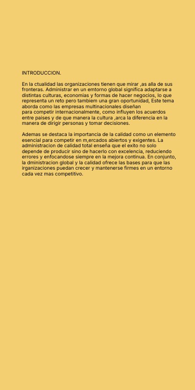 CONCLUSION. El estudio de la administración global, comparada y de calidad nos muestra que las organizaciones enfrentan un escenario dinamico donde la competencia ya no es unicamente local, sino internacional. Para tener exito, no basta con reproducir los mismos metodos en todos los paises, sino que se requiere comprender y dapatarse a las diferencias culturale, politicas y economicas que influyen en la forma de hacer negocios. Las alianzas entre naciones y los bloques economicos abren oportunudades importantes, pero al mismo tiempo exigen que las empresas desarrollen estrategias flexibles y competitivas. Aui es donde la calidad se convierte en un pilar fundamental no se trata solo de producir mas, sino de garantizar productos y servicios que cumplan con altos estandares y satisfagan plenamente a los clintes. En conjunto la vision global y el compromiso con la calidad total fotalece a las organizaciones, ayudandolas a innovar, a diferenciarse en mercados cada vez mas exigentes y a generar un impacto positivo en su entorno.