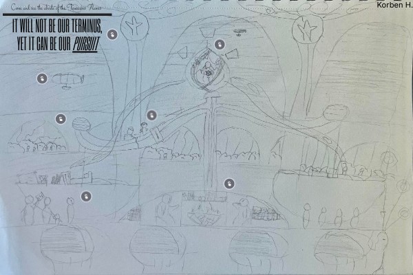 The principal foundation of utopian thinking revolves around imagining a better realm for humanity, and the ideals that facilitate such a place. Likewise, the top of the scale is the symobolic hearth of the ideals the Tenancious Flames are working towards in their own society. In this hearth, there is a indiscernable woman that carries a healthy sprout, which I percieve as a symbol of prosperity. This woman is indiscernable due to the practices of the Flames being enigmatic in nature; the ideal will always be familiar to those in the community, but the methods that work towards said ideal are subject to drastic changes across time. Afterall, all utopias (ex. Shakers, religious communes, Robert Owen) tend to change to avoid stagnation, which is when progress can no longer be made in preference for a transcedent, unyielding value. Regardless, this hearth is invigorated by many elements throughout this poster, such as the agriculture, the offerings from the community (the wisps that come from these objects tend to the flame), intellectual debates, and those that travel to other regions by airship.