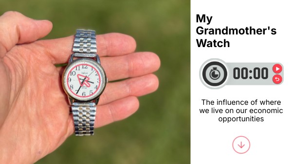 My grandmother's watch is a reminder to me that her choices and opportunities have impacted me. Her choice to move to the United States has left a lifelong impact on me and on future generations. We each should acknowledge that the opportunities we experience are a result of many people who have gone on before us. Graditude and humility for what we have are important, because we have not achieved We must also recognize that other people face limitations in theier opportunities due to where they live. People in areas that have less economic and educational opportunities deserve compassion through their unique circumstances, becuase the very place they live impacts their access to those things.