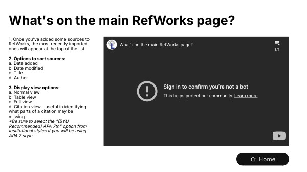 1. Once you’ve added some sources to RefWorks, the most recently imported ones will appear at the top of the list. 2. Options to sort sources: a. Date added b. Date modified c. Title d. Author 3. Display view options: a. Normal view b. Table view c. Full view d. Citation view - useful in identifying what parts of a citation may be missing. *Be sure to select the "(BYU Recommended) APA 7th" option from Institutional styles if you will be using APA 7 style.