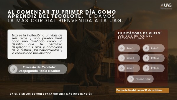 Al comenzar tu primer día como aprendiz del Tecolote, te damos la más cordial bienvenida a la UAG.