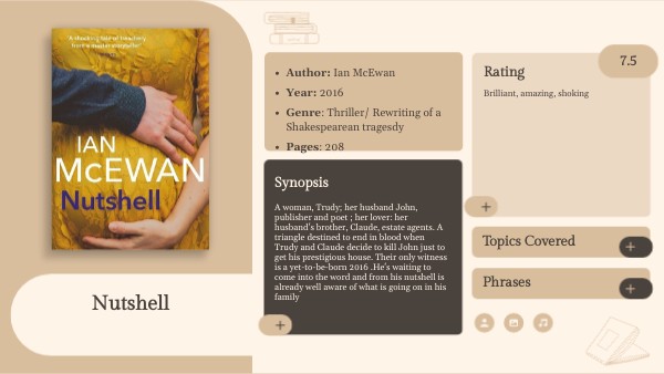A woman, Trudy; her husband John, publisher and poet ; her lover: her husband's brother, Claude, estate agents. A triangle destined to end in blood when Trudy and Claude decide to kill John just to get his prestigious house. Their only witness is a yet-to-be-born 2016 .He's waiting to come into the word and from his nutshell is already well aware of what is going on in his family