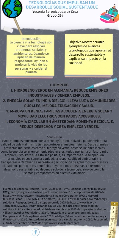 Conclusión Estos ejemplos muestran que la tecnología, bien utilizada, puede mejorar la calidad de vida y al mismo tiempo proteger al medioambiente. Desde grandes proyectos industriales como el hidrógeno verde, hasta soluciones locales como la energía solar en comunidades rurales, todos aportan a un futuro más limpio y justo. Para que esto sea posible, es importante que se apliquen principios éticos como la equidad, la responsabilidad ambiental y la transparencia. También se necesita la participación de gobiernos, empresas y ciudadanos para que los beneficios lleguen a más personas. En resumen, el desarrollo sustentable no depende solo de la tecnología, sino de cómo la usamos y compartimos en nuestra vida diaria.