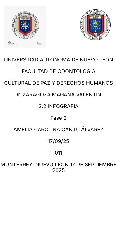 UNIVERSIDAD AUTÓNOMA DE NUEVO LEON FACULTAD DE ODONTOLOGIA CULTURAL DE PAZ Y DERECHOS HUMANOS Dr. ZARAGOZA MAGAÑA VALENTIN 2.2 INFOGRAFIA Fase 2 AMELIA CAROLINA CANTU ÁLVAREZ 17/09/25 011 MONTERREY, NUEVO LEON 17 DE SEPTIEMBRE 2025