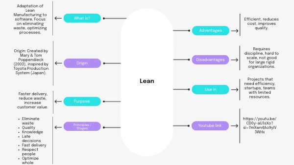 Adaptation of Lean Manufacturing to software. Focus on eliminating waste, optimizing processes.