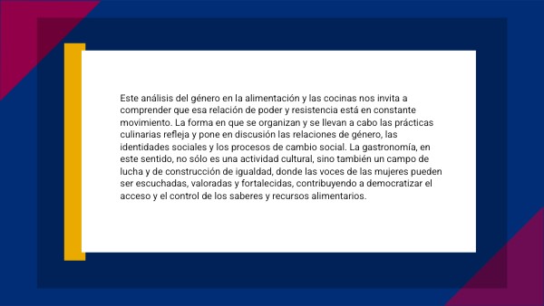 En ese sentido, la percepción de la comida como un acto cargado de significado simbólico y social evidencia que los sabores y las técnicas culinarias están íntimamente ligados a las construcciones sociales, y que estas prácticas alimentarias, invisibles a veces en su carácter cotidiano, contienen los códigos que nos enseñan quiénes somos, qué roles tenemos y qué relaciones de poder sostenemos en nuestro entorno social. La cocina, y todo lo que ella implica, es un escenario vivo de resistencia, de reproducción y también de potencial transformación de las relaciones de género. La revisión de estos significados nos permite comprender que, en cada acto de cocinar, en cada ritual, se expresan las normas, los valores y las jerarquías que conforman nuestras culturas y nuestras historias sociales.