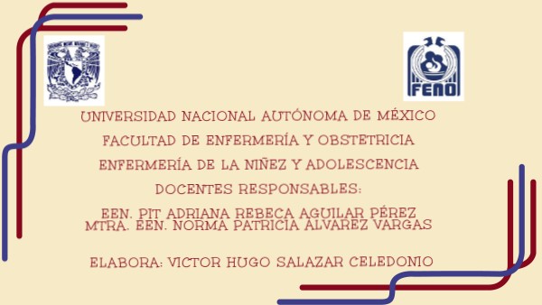 Universidad Nacional Autónoma de México Facultad de Enfermería y Obstetricia Enfermería de la niñez y adolescencia Docentes responsables: EEN. PIT Adriana Rebeca Aguilar Pérez MTRA. EEN. Norma Patricia Álvarez Vargas elabora: Victor hugo Salazar Celedonio