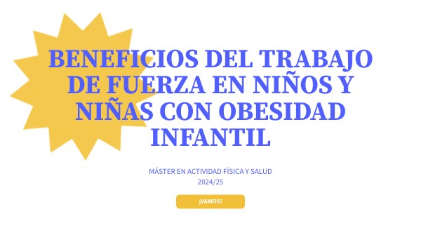 La obesidad infantil es un probema de salud pública que ha ido incrementando, asociándose con una mayor incidencia de trastornos metabólicos y cardiobasculares.Obesidad infantil es la acumulación excesiva de grasa corporal en niño/as que puede afectar de forma negativa a su salud. Su diagnóstico se fundamenta en el Índice de Masa Corporal (IMC) que relaciona el peso y la estructura del niño/a. Estudios recientes demuestran que el Entrenamiento de Fuerza (EF) es una estrategia efectiva para mejorar la salud de niños/as con obesidad infantil.