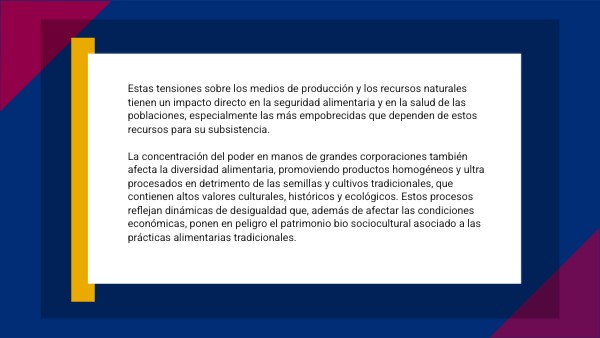 Además, el control del mercado por parte de conglomerados favorece una distribución desigual, en la que las grandes empresas que acumulan capital dejan en desventaja a los pequeños productores y a las comunidades tradicionales, intensificando las desigualdades sociales y económicas. La subida de precios en los alimentos, junto con la imposibilidad de acceder a una oferta diversificada y culturalmente adecuada, refuerza las brechas de acceso y pone en peligro la soberanía alimentaria de los países. Por último, se pone de manifiesto que la falta de regulación efectiva permite que estos monopolios sigan expandiendo su poder sin límites, afectando la calidad, la disponibilidad y la accesibilidad de los alimentos en el mundo.