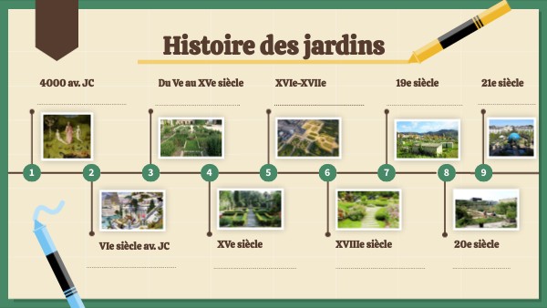 1- Décrivez l'allure de ces jardins. Quels sont les éléments caractéristiques ? 2- Donnez le nom du fameux château français qui arbore ce type de jardin (visible sur l'image 5 de la frise chronologique). 3- Qu'est ce que l'art topiaire ?