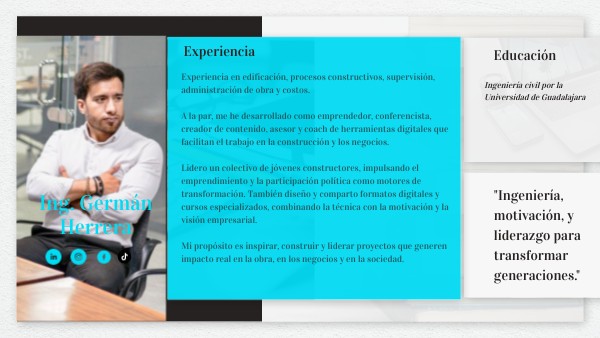 Experiencia en edificación, procesos constructivos, supervisión, administración de obra y costos. A la par, me he desarrollado como emprendedor, conferencista, creador de contenido, asesor y coach de herramientas digitales que facilitan el trabajo en la construcción y los negocios. Lidero un colectivo de jóvenes constructores, impulsando el emprendimiento y la participación política como motores de transformación. También diseño y comparto formatos digitales y cursos especializados, combinando la técnica con la motivación y la visión empresarial. Mi propósito es inspirar, construir y liderar proyectos que generen impacto real en la obra, en los negocios y en la sociedad.
