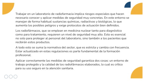 Durante tu primer turno, comienzas conociendo los diferentes reactivos del laboratorio. Tu supervisor te explica cómo se clasifican y para qué se utiliza cada uno. Observas cómo los químicos se almacenan en armarios ventilados, los radiactivos en vitrinas blindadas y los biológicos en cabinas de bioseguridad. Aprendes a reconocer las etiquetas, los símbolos de peligro y la importancia de manipular cada sustancia según su naturaleza.