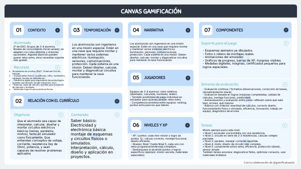 Misión ejemplo para cada nivel: • Nivel 1: encender una bombilla con una resistencia. • Nivel 2: circuito en serie de 2-3 resistencias, calcular voltajes parciales. • Nivel 3: paralelo, manejar corriente repartida. • Nivel 4: mixto; diseño de circuito más complejo. • Nivel 5: componente activo extra, eficiencia, protección (diodo), sensor simple. También tareas sorpresa: diagnosticar fallos, optimizar consumo, usar materiales limitados