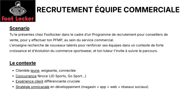 Tu te présentes chez Footlocker dans le cadre d’un Programme de recrutement pour conseillers de vente, pour y effectuer ton PFMP, au sein du service commercial. L'enseigne recherche de nouveaux talents pour renforcer ses équipes dans un contexte de forte croissance et d'évolution du commerce sportswear, et ton tuteur t'invite à suivre le parcours.