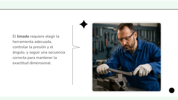 El limado requiere elegir la herramienta adecuada, controlar la presión y el ángulo, y seguir una secuencia correcta para mantener la exactitud dimensional.