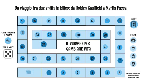 Il gioco dell’oca letterario è un percorso interattivo e narrativo che unisce le storie di "Il fu Mattia Pascal" di Luigi Pirandello e "Il giovane Holden" di J.D. Salinger. Attraverso 34 caselle, il giocatore accompagnerà i protagonisti nelle loro fughe, dubbi e scoperte, riflettendo sui temi principali dei due romanzi: l’identità, la fuga dalla realtà, il confronto con se stessi e l’accettazione. Ogni casella propone contenuti narrativi, sfide e carte speciali che permettono di approfondire la comprensione dei libri in modo creativo e coinvolgente. Lo scopo è stimolare la riflessione sulle difficoltà del viaggio interiore e sull’importanza di affrontare la verità personale per crescere.