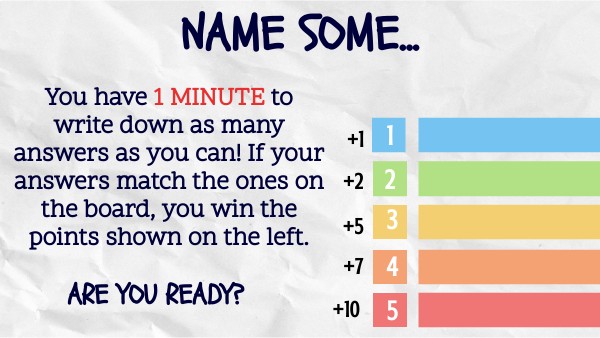 You have 1 MINUTE to write down as many answers as you can! If your answers match the ones on the board, you win the points shown on the left.