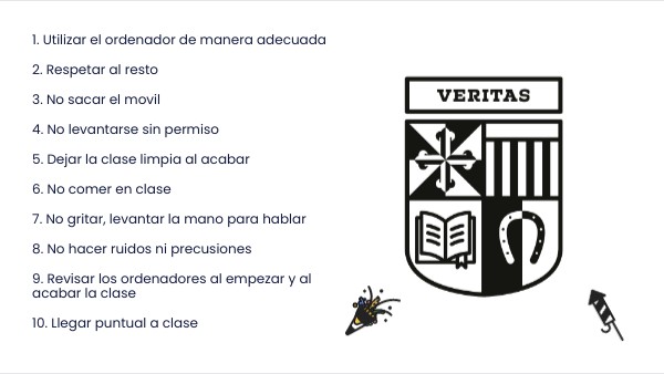1. Utilizar el ordenador de manera adecuada 2. Respetar al resto 3. No sacar el movil 4. No levantarse sin permiso 5. Dejar la clase limpia al acabar 6. No comer en clase 7. No gritar, levantar la mano para hablar 8. No hacer ruidos ni precusiones 9. Revisar los ordenadores al empezar y al acabar la clase 10. Llegar puntual a clase