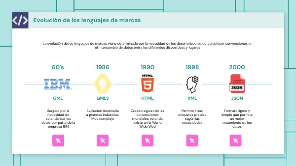 La evolución de los lenguajes de marcas viene determinada por la necesidad de los desarrolladores de establecer convenciones en el intercambio de datos entre los diferentes dispositivos y lugares