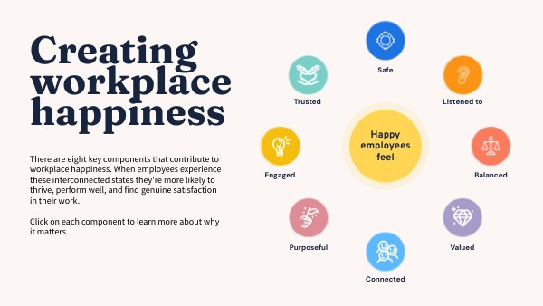There are eight key components that contribute to workplace happiness. When employees experience these interconnected states they're more likely to thrive, perform well, and find genuine satisfaction in their work. Click on each component to learn more about why it matters.