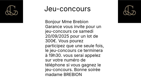 Bonjour Mme Brebion Garance vous invite pour un jeu-concours ce samedi 20/09/2025 pour un lot de 300€. Vous pourez participez que une seule fois, le jeu-concours ce terminera à 19h30. vous serai appelez sur votre numéro de téléphone si vous gagnez le jeu-concours. Bonne soirée madame BREBION