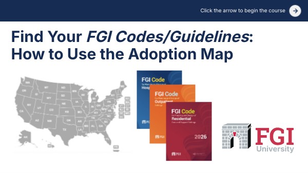 FGI provides valuable education for organizations, teams, and individuals involved in the planning and design of health and residential care environments. It equips professionals with a deeper understanding of the FGI Codes/Guidelines requirements and their application to the design of safe and functional health and residential care settings.