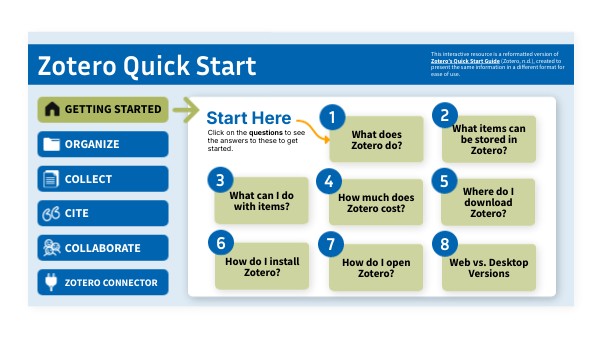 This interactive resource is a reformatted version of Zotero’s Quick Start Guide (Zotero, n.d.), created to present the same information in a different format for ease of use.