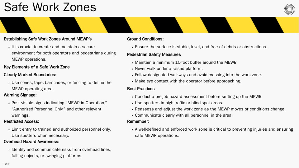 - A well-defined and enforced work zone is critical to preventing injuries and ensuring safe MEWP operations.