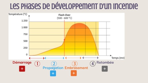 L'incendie est localisé, la température s'élève rapidement, de la fumée et des gaz chauds se dégagent et remplissent les volumes libres