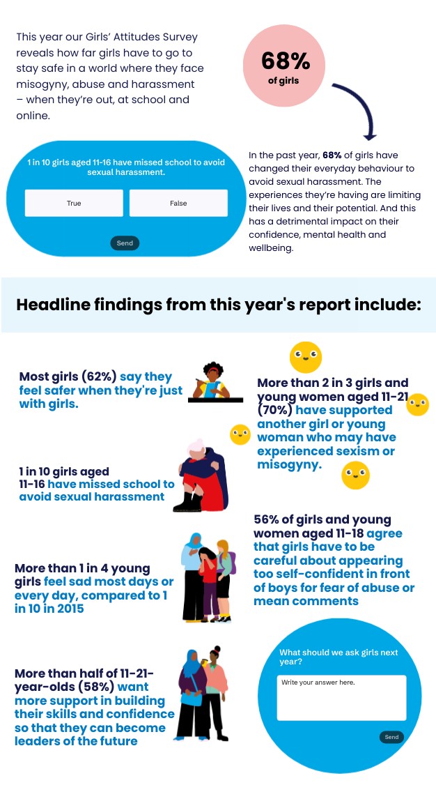 This year our Girls’ Attitudes Survey reveals how far girls have to go to stay safe in a world where they face misogyny, abuse and harassment – when they’re out, at school and online.