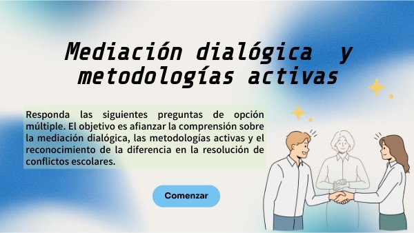 Responda las siguientes preguntas de opción múltiple. El objetivo es afianzar la comprensión sobre la mediación dialógica, las metodologías activas y el reconocimiento de la diferencia en la resolución de conflictos escolares.