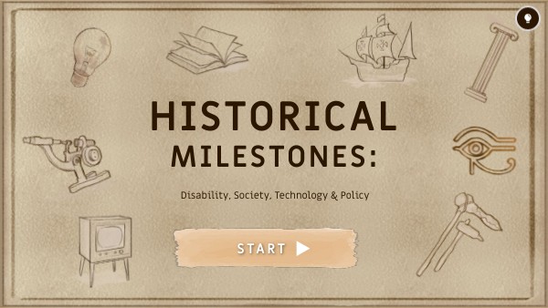 Welcome to Historical Milestones: Important discoveries in Disability, Society, Technology, and Policy. Here you will get a glimpse of major advancements in human civilization within the past century. If you wish to be guided through the slides with the audio narrator, just click on any paragraph or bulleted text (excluding titles) - and make sure you have activated the audio feature for the presentation. To navigate, click the arrows. Should the finger pointing symbol be present on a slide, meaning it will be indicated as a "button", it will have interactive clickable elements - feel free to engage with the elements, such as images that expand into new windows or take you to outside links.