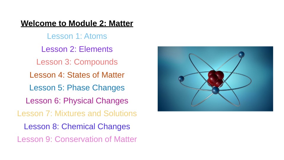 Welcome to Module 2: Matter Lesson 1: Atoms Lesson 2: Elements Lesson 3: Compounds Lesson 4: States of Matter Lesson 5: Phase Changes Lesson 6: Physical Changes Lesson 7: Mixtures and Solutions Lesson 8: Chemical Changes Lesson 9: Conservation of Matter
