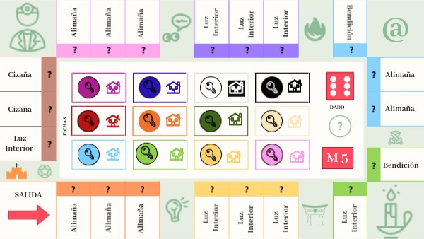 Cada jugador/a debe elegir un color: azul, verde, amarillo o rosa. Así obtiene una ficha para marcar su posición y 6 casas para indicar las virtudes que se posee. Cada jugador debe coger la ficha de su color y colocarla en la casilla de salida. Para empezar a jugar, pincha sobre el dado y mueve tu ficha hasta la casilla que corresponda. En cada casilla debe haber una alimaña (cizaña) o una luz interior (bendición). Sí caes en luz interior o bendición. ¡Enhorabuena, has conseguido una nueva virtud! Si caes en alimaña o cizaña debe dejar una casita (virtud), que se recupera si caes un una bendición. Casillas especiales: las casillas con iconos contienen ideas para profundizar en la moradas del castillo. Ganará aquel jugador/a que tenga el mayor número de casas sobre el tablero una vez que todas hayan recorrido el tablero.