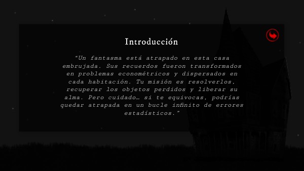 “Un fantasma está atrapado en esta casa embrujada. Sus recuerdos fueron transformados en problemas econométricos y dispersados en cada habitación. Tu misión es resolverlos, recuperar los objetos perdidos y liberar su alma. Pero cuidado… si te equivocas, podrías quedar atrapada en un bucle infinito de errores estadísticos.”