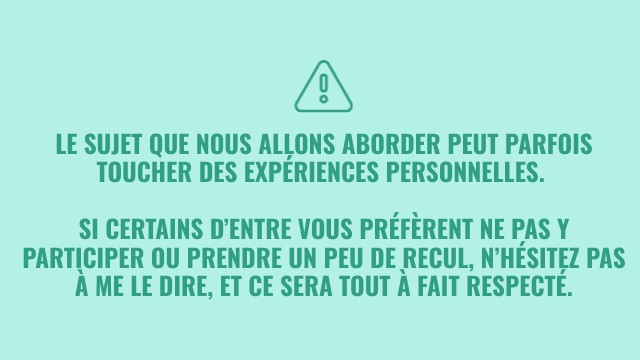 Le sujet que nous allons aborder peut parfois toucher des expériences personnelles. Si certains d’entre vous préfèrent ne pas y participer ou prendre un peu de recul, n’hésitez pas à me le dire, et ce sera tout à fait respecté.