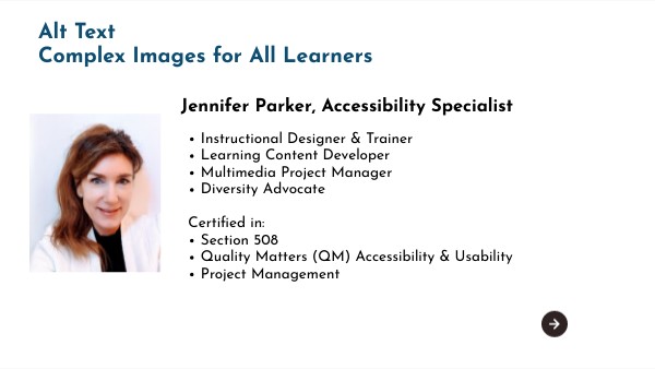 Alt Text: Alternative text is used to describe the content & function of an image. Complex Images: Images that contain substantial information that can not be conveyed in short phrases. Why is this important to an educational institution? The U.S. Department of Education's National Center for Education Statistics (NCES) reported that 20.5% of undergraduate students had a disability in the 2019–2020 academic year - Only roughly 1/3 of those students reported this disability to their institutions. Pedagogy: Learners using screen readers may miss essential elements that are pedagogically tied to your learning objectives. Accurate descriptions ensure all learners can fully engage in your course content.